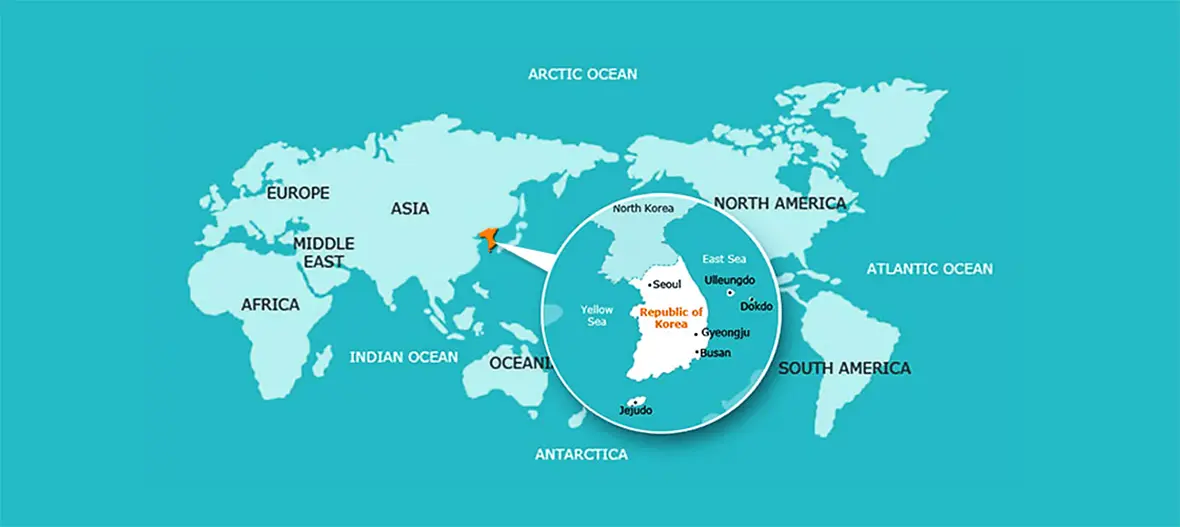 The Korean peninsula, roughly 1,030 km long and 175 km at its narrowest point, has a total land area of 100,033 km2 and is located in Northeast Asia. With Seoul as its capital city, Korea is neighbored by Japan to the east, China to the west and the Democratic People’s Republic of Korea (North Korea) across the northern border.